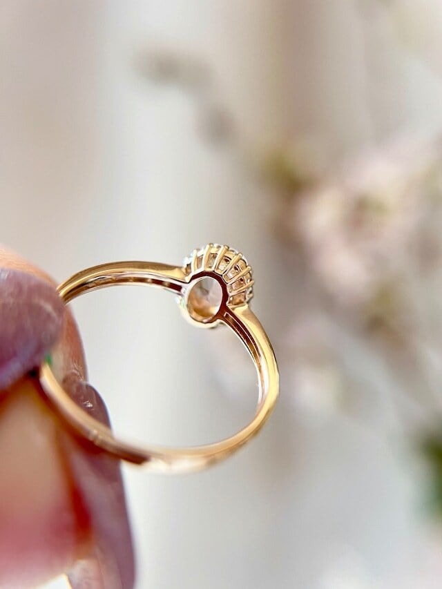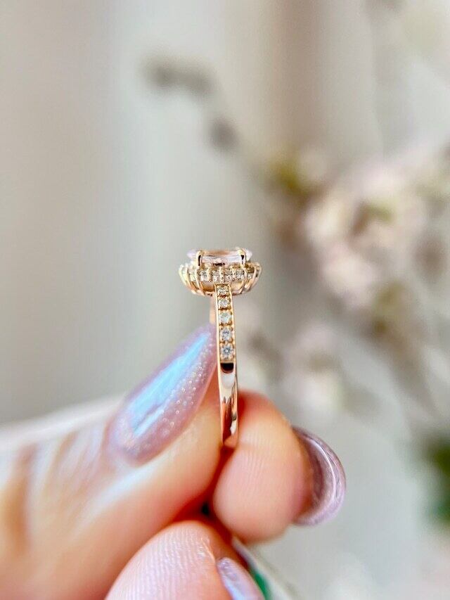 【石】モルガナイト 【素材】K18PG 【石目】モルガナイト0.6ct/ダイヤ0.19ct 【サイズ】縦9×横7.5㎜ 【色味】B 【色味指標】 A→モルガのイメージ通りの淡いピンク B→Aよりさらに淡いピンク C→茶色がかったピンク